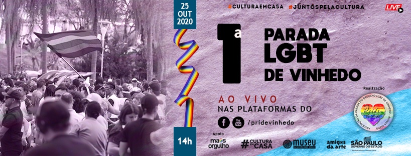No dia 25 de outubro, domingo, às 14h, a Associação da Parada do Orgulho LGBT de Vinhedo – Bianca Niero, com apoio do programa +Orgulho, promove a 1ª Parada Virtual do Orgulho LGBT de Vinhedo, uma iniciativa para viabilizar a realização de uma Parada LGBT totalmente online em respeito a recomendação de isolamento social imposto pela pandemia do novo coronavírus. As ações serão veiculadas por meio da plataforma de streaming #CulturaEmCasa e também pelo Facebook e YouTube da associação. O tema do evento será Democracia e Diversidade, Nosso Voto é Nossa Voz.